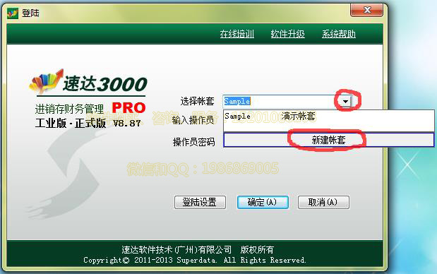 1.打开速达3000客户端,点击"选择账套"右边的三角小箭头,点下拉菜单中的"新建账套"。