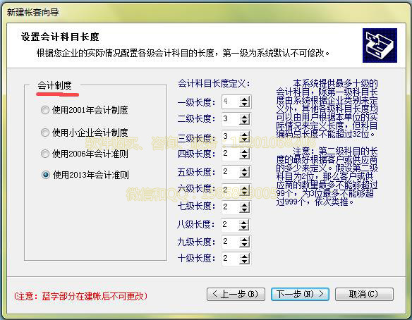 3.这是会计做账的选项,会计制度一般选择2013小企业会计准则,主要还是根据会计的做账习惯,因为科目是可以增加修改的,科目长度以后不够用也可以修改,点击"下一步"。