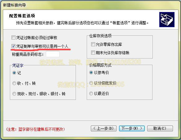 4.左边是财务选项,主要选择凭证制单与审核是否可以同一人,凭证字一般选择记字。右边进销存选项中,是否运行零库存出库和负库存结账,根据情况选择,最好不允许,避免成本计算错误。另外一个价格跟踪方式,也是根据公司情况选择,点击"下一步"。