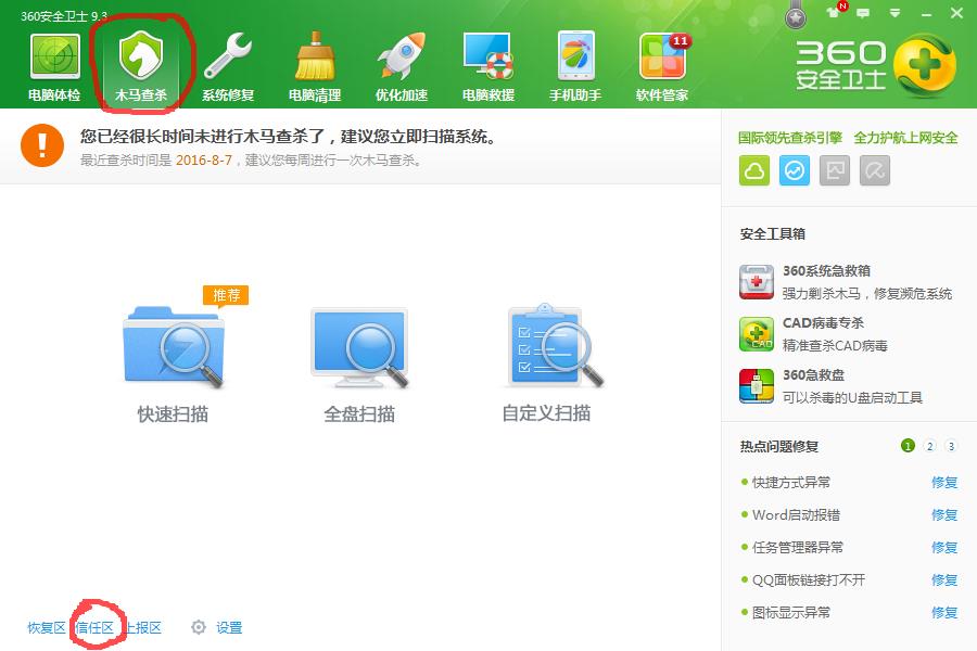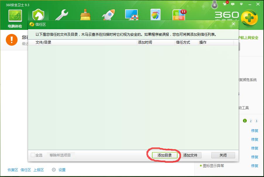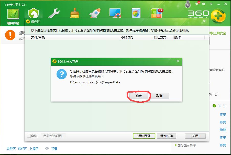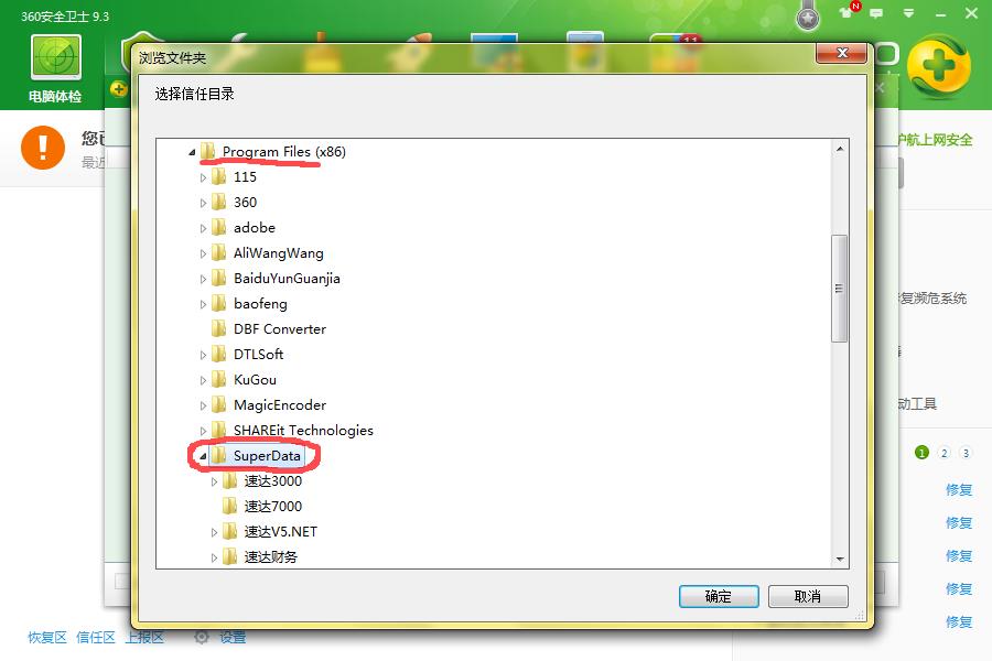 360安全卫士添加信任列表 | 浏览:686 | 更新: 2016-09-09 10:25 | 标签:速达图文教程 速达视频教程 了解详情 优惠信息限时特价优惠,走过路过不要错过! 速达软件是企业应用比较广泛的企业财务和业务管理软件。 适合版本 速达财务,速达v3.net财务,速达V3财务 方法/步骤 360安全卫士添加信任列表 2016-07-30 START 1 1.打开360安全卫士,点到“木马查杀”选项卡,点左下角“信任区”。 2 2.在弹出的框中,点“添加目录”。 3 3.选择信任目录时,找到速达软件安装路径,一般是默认的superdata文件夹。 4 4.点“确定”。 5 5.信任列表中有了这个目录,就是添加信任成功了,关闭退出360安全卫士就行了。 END 注意事项 一定要定期做好数据备份,以防电脑突然出现问题导致数据丢失。 关注本网,查看更多使用教程。 为你推荐 速达财务凭证批量打印12082016.9.19 速达3000凭证批量打印12932016.9.19 速达财务报表查询16862016.9.15 速达财务反结账10082016.8.22 电脑Ip地址查看方法10602016.8.01 相关标签速达财务速达3000速达5000